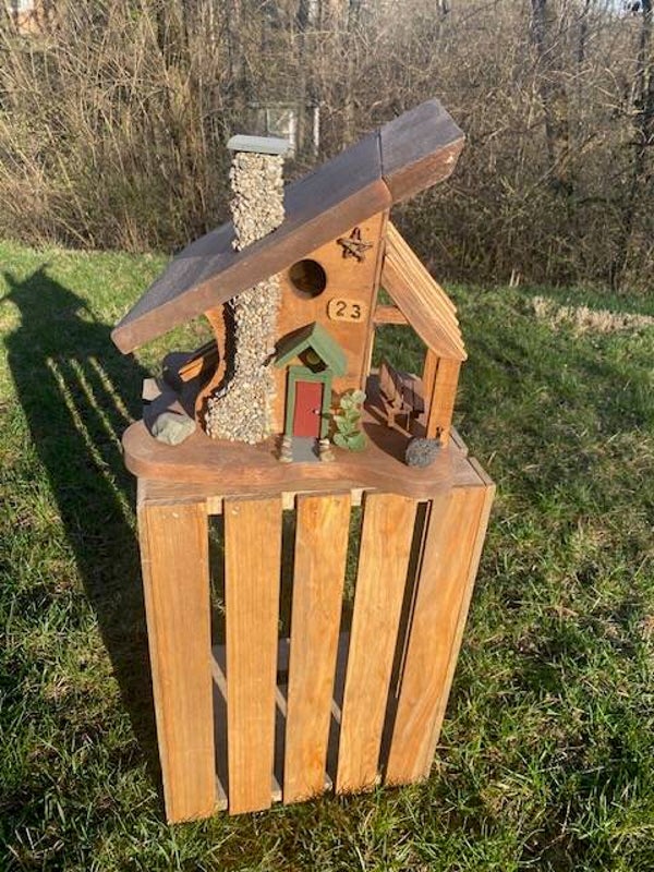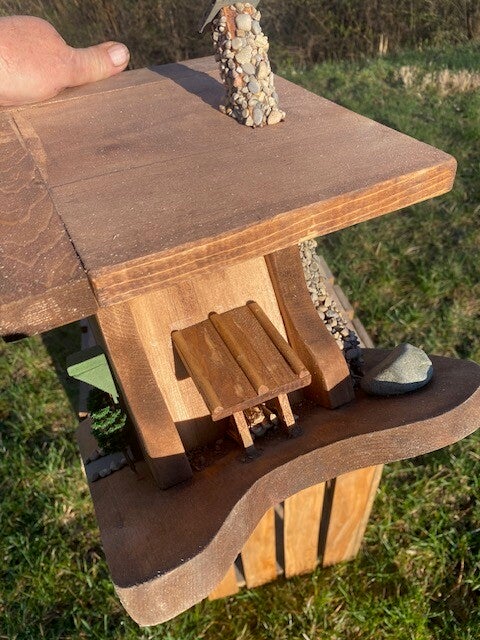 The birdhouse features a sloped roof, round entry hole, and a charming front door with house number “23.” A unique stone-style chimney feeder runs along the side of the cabin, allowing birds to snack while visiting the nesting house. The design also includes carved accents like a star, porch seating area, and natural-looking rocks, giving it the feel of a tiny countryside retreat.