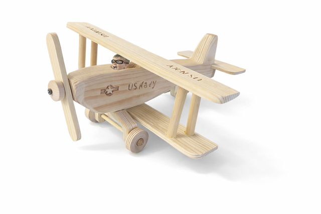 This is a beautifully detailed handcrafted wooden biplane, capturing the classic spirit of early aviation with a rugged, natural charm.